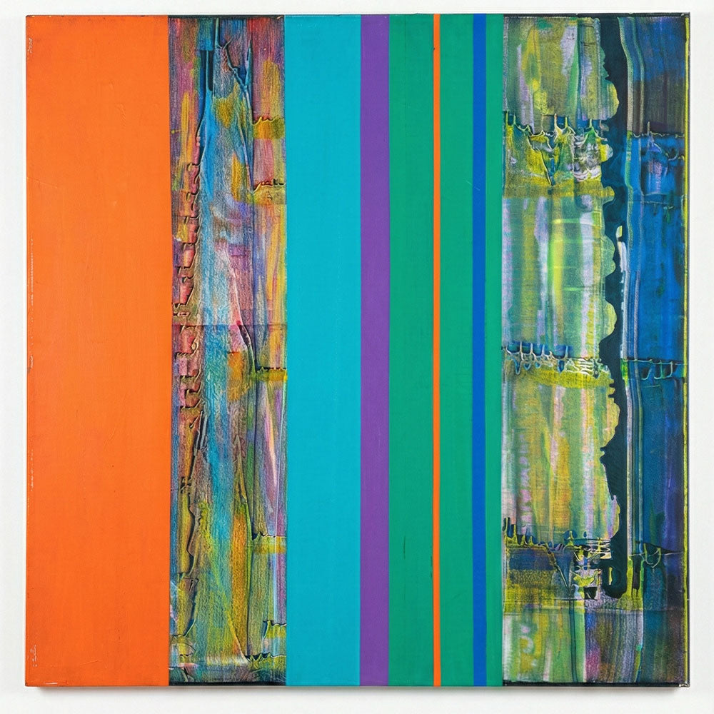 מה אני רואה ביצירה: הקומפוזיציה בנויה על ניגודים מרתקים. מצד שמאל, גוש צבע כתום אטום, חזק ונקי, שמעניק ליצירה בסיס חם ויציב. במרכז, פסים דקים ומדויקים של טורקיז, סגול וירוק שיוצרים תחושה גרפית מודרנית. אבל הקסם האמיתי קורה ברצועות המרקם (הטקסטורה) – אלו הפסים שבהם "שברתי" את הצבע השטוח ויצרתי ערבובים ציוריים של כחולים, צהובים וירוקים, המזכירים השתקפויות במים או קורוזיה אמנותית.